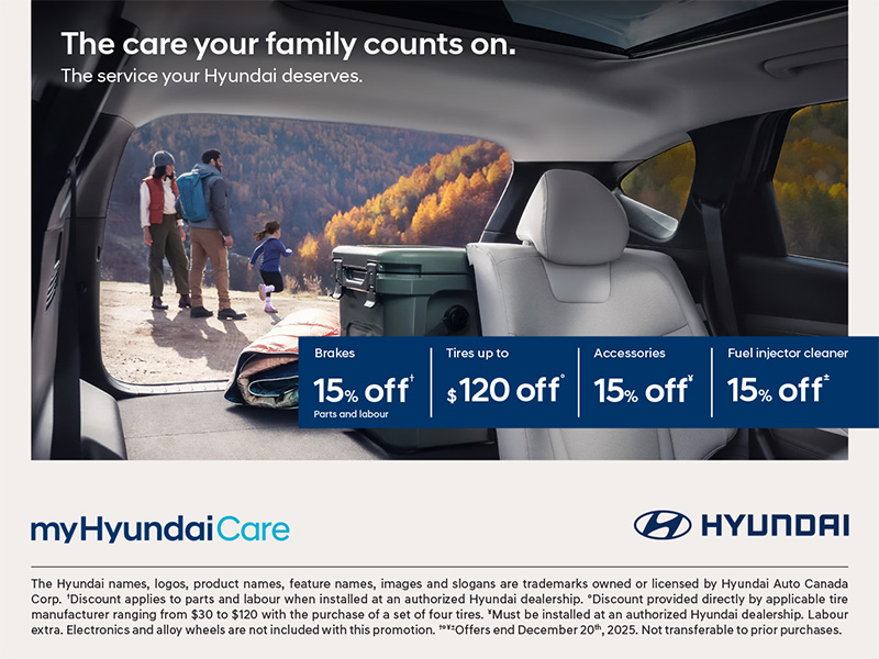 There’s never been a better time to prepare for all of your fall plans. Get through the season in style with your choice of Genuine Hyundai accessories. Electronics and alloy wheels are not included with this promotion. Please ask your service advisor for details. Must be installed at an authorized Hyundai dealership. Labour is extra. Coupon cannot be combined with any other offers. Coupon is required at time of service. Not transferable to prior purchases. Offer ends December 20th, 2025.