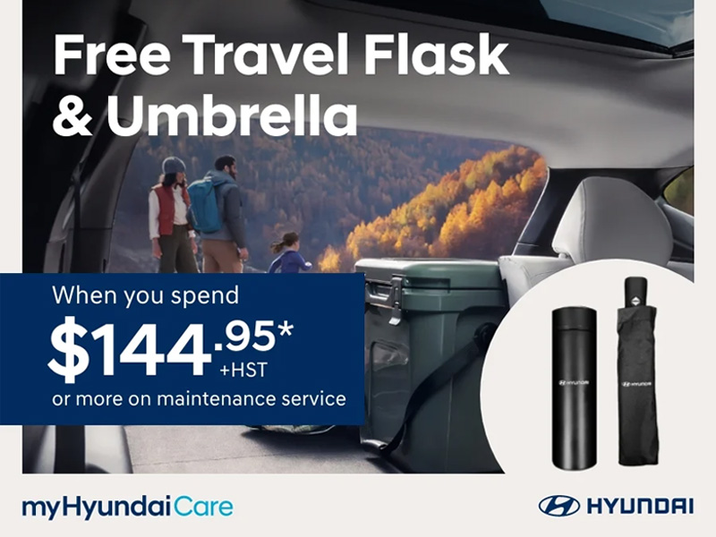 Please speak to your service advisor for details. Offer applicable to vehicle service maintenance only. Required offer value* reflects before tax pricing. Offer is not applicable to parts and accessories purchases and installation. Coupon cannot be combined with any other offers. Not transferable to prior vehicle maintenance services or services currently in progress. †The Hyundai travel flask and umbrella may not be exactly as shown. Coupon must be presented at time of service. While quantities last. Offer ends December 20th, 2025.
