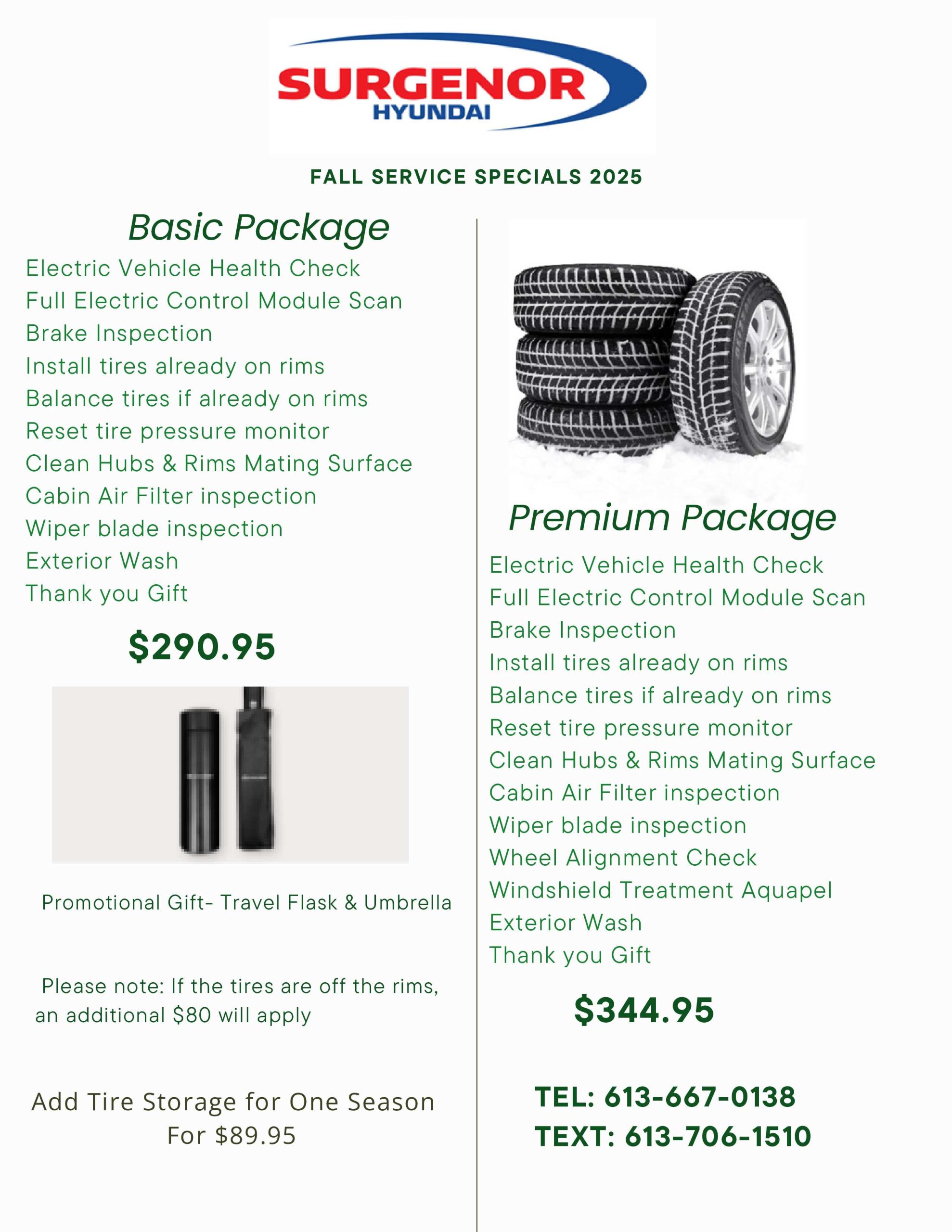 Keep Your EV Ready for the Season! Get your vehicle in top shape with our limited-time Fall Service Packages at Surgenor Hyundai. Choose from our Basic Package ($290.95) or Premium Package ($344.95) — both designed to ensure your electric vehicle performs at its best as temperatures drop.